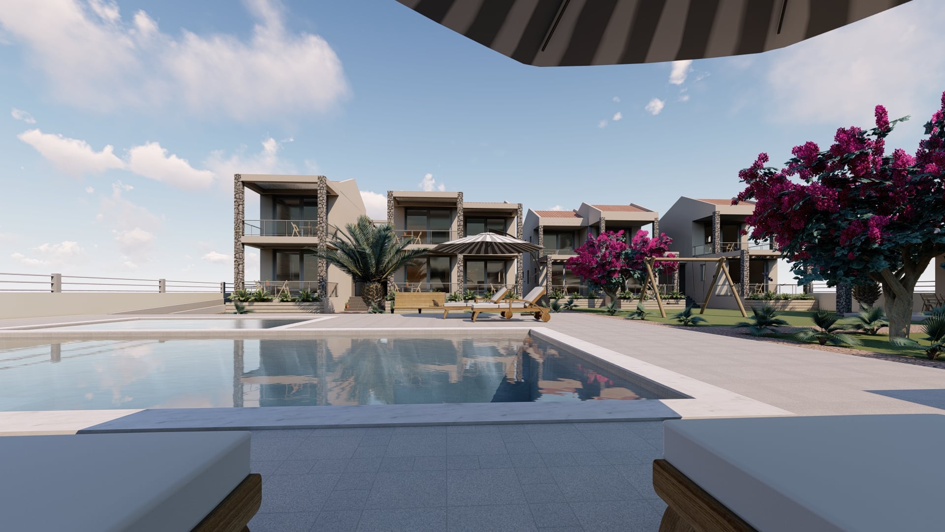 Η μελέτη αφορά τη δημιουργία ενός σύγχρονου συγκροτήματος επιπλωμένων κατοικιών, σχεδιασμένου με στόχο την υψηλή ποιότητα φιλοξενίας και την αρμονική ένταξη στο φυσικό τοπίο της Παραλίας Κουρούτας. Η αρχιτεκτονική σύνθεση αξιοποιεί καθαρές γραμμές, φυσικά υλικά και μοντέρνες γεωμετρικές φόρμες, δημιουργώντας έναν χώρο που αποπνέει ηρεμία, άνεση και σύγχρονη αισθητική. Οι επιμέρους μονάδες φιλοξενίας αναπτύσσονται με τρόπο που εξασφαλίζει ιδιωτικότητα, λειτουργικότητα και άμεση σχέση με τον περιβάλλοντα χώρο. Στο υπαίθριο τμήμα, ο σχεδιασμός ενισχύει την εμπειρία των επισκεπτών μέσω διαμορφωμένων ζωνών αναψυχής, μεγάλης κεντρικής πισίνας και πλούσιου φυτικού τοπίου. Η χρήση μεσογειακής βλάστησης και φυσικών υφών συμβάλλει στη δημιουργία ενός ζεστού και οικείου περιβάλλοντος, ιδανικού για χαλάρωση. Το έργο εκφράζει μια ανθρωποκεντρική σχεδιαστική φιλοσοφία, όπου η λειτουργικότητα, η άνεση και η αισθητική συνυπάρχουν, προσφέροντας μια ποιοτική και αναβαθμισμένη εμπειρία διαμονής σε έναν από τους ομορφότερους προορισμούς της περιοχής.