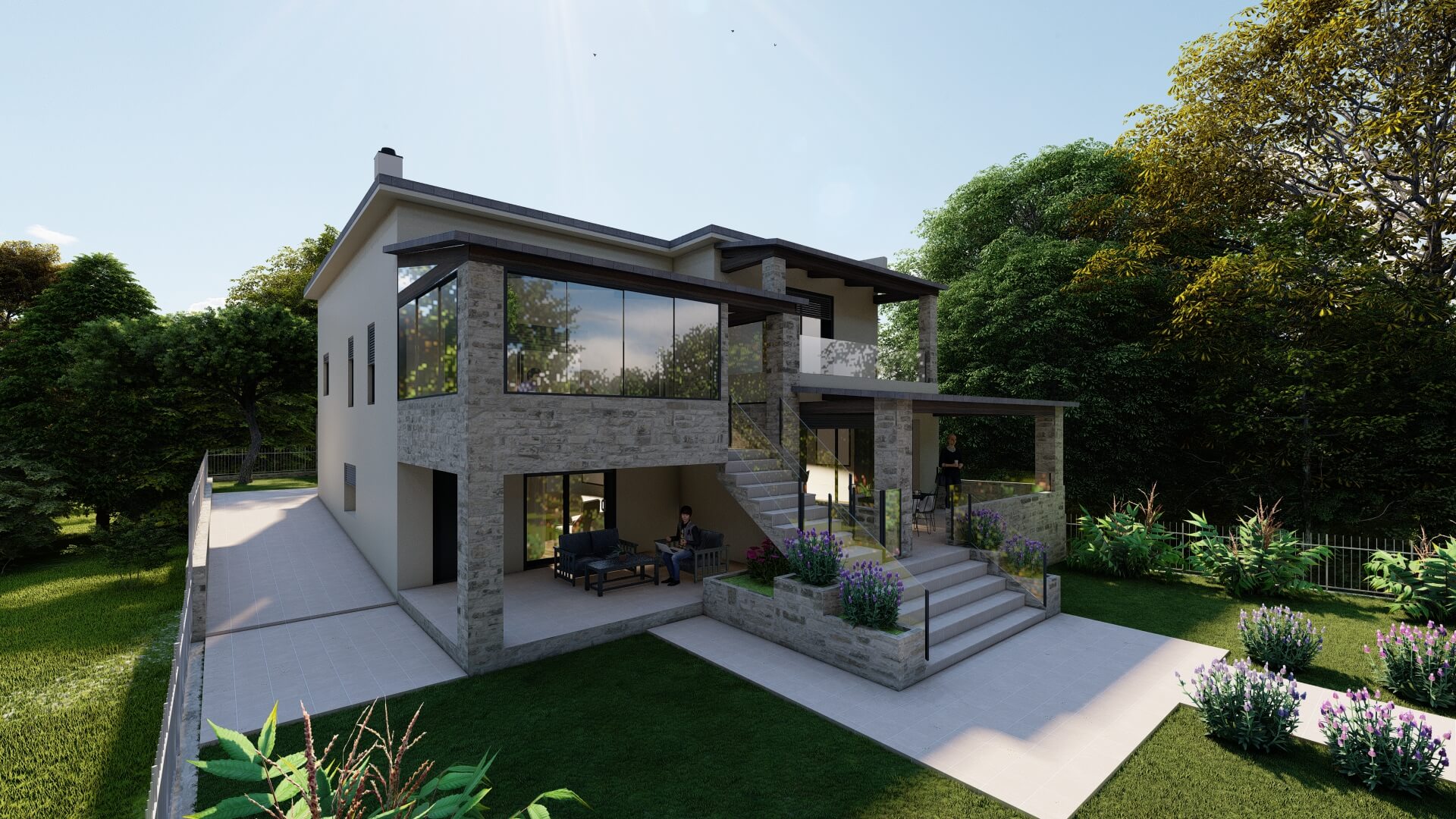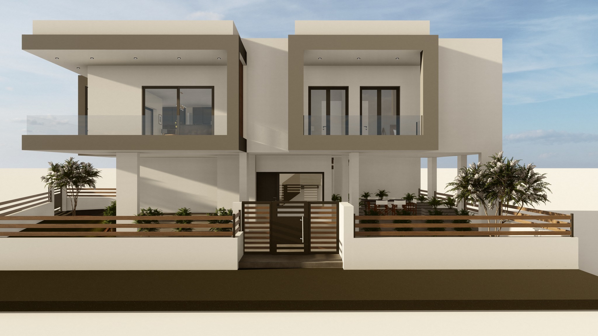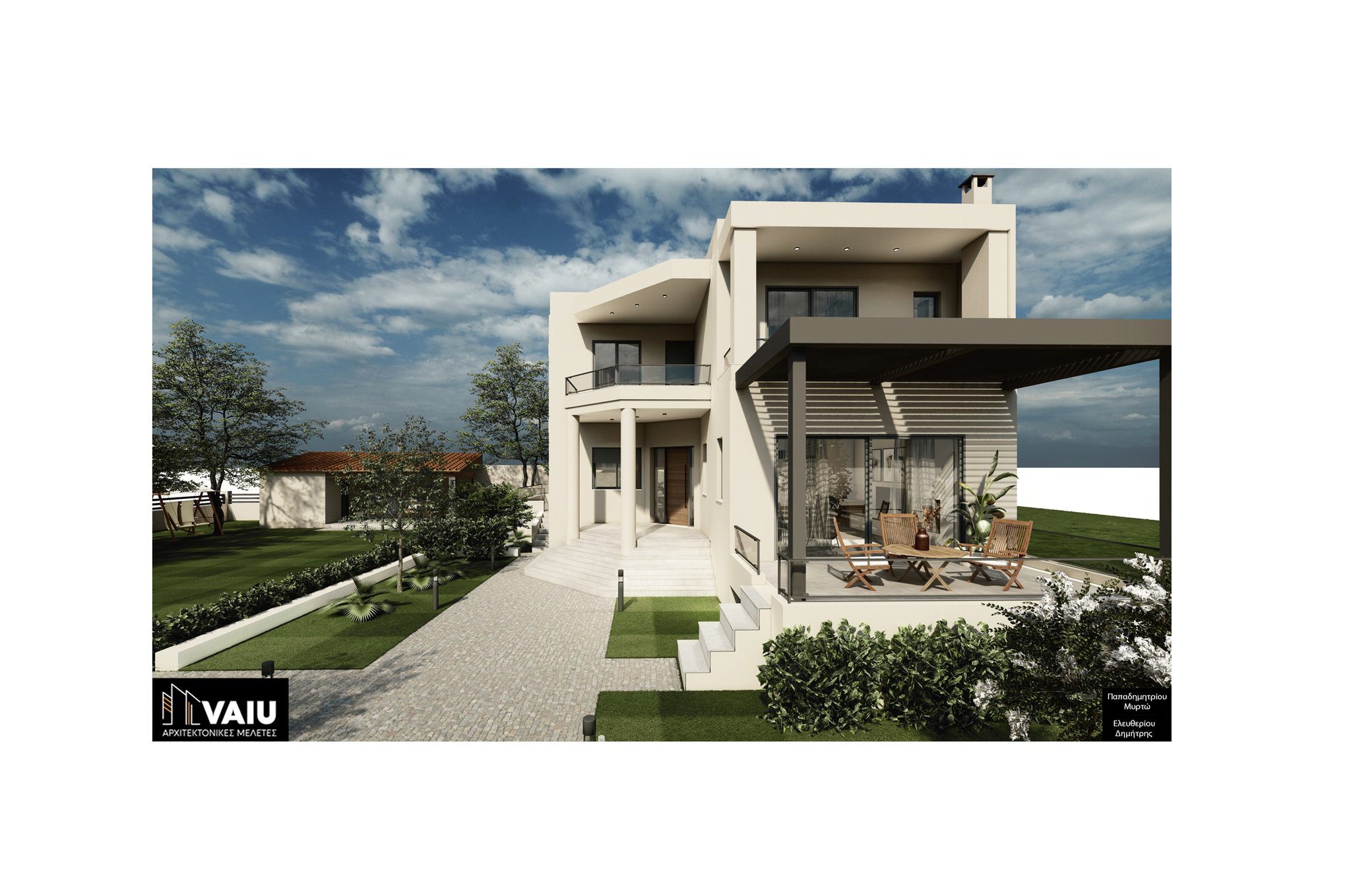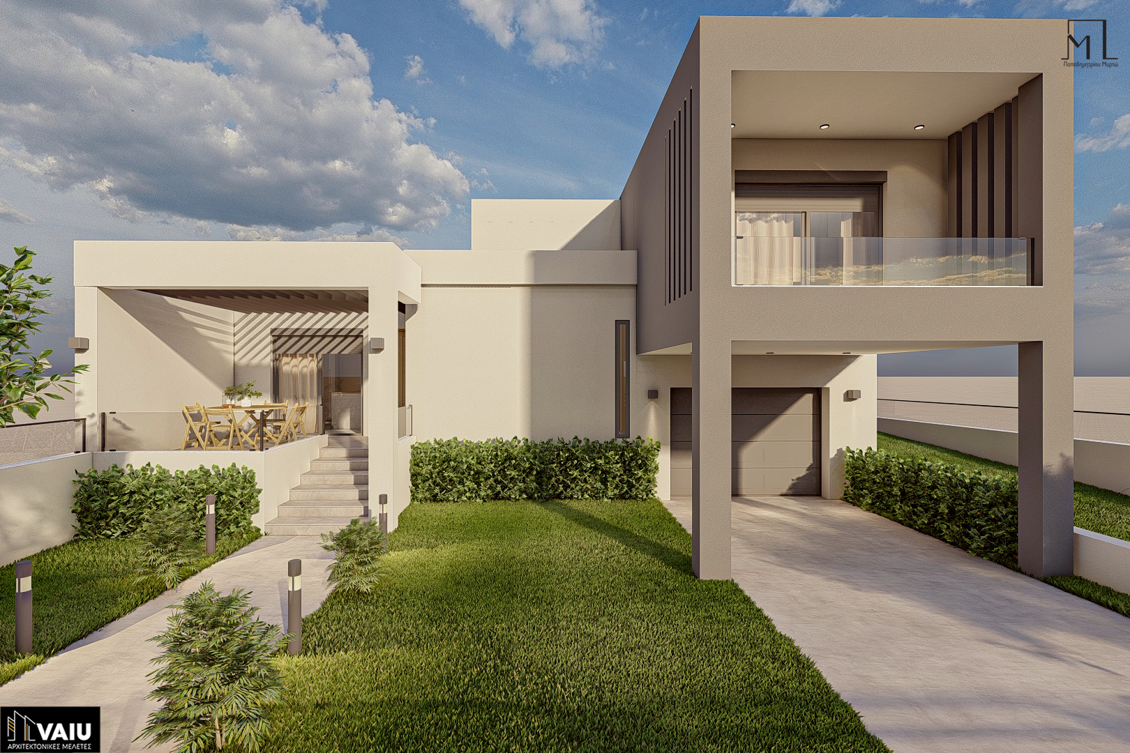 Η αρχιτεκτονική μελέτη αφορά τη δημιουργία μιας διώροφης υπερυψωμένης κατοικίας, σχεδιασμένης με έμφαση στη λειτουργικότητα, τη γεωμετρική καθαρότητα και τη σύνδεση με το περιβάλλον. Η σύνθεση βασίζεται σε καθαρές γραμμές και ογκοπλαστικές ισορροπίες που αναδεικνύουν τη σύγχρονη μορφολογία του κτιρίου. Η υπερύψωση του ισογείου εξασφαλίζει καλύτερη οπτική θέαση και φυσικό αερισμό, ενώ τα μεγάλα ανοίγματα ενισχύουν τη σχέση εσωτερικού–εξωτερικού χώρου. Η επιλογή υλικών και χρωματικών αντιθέσεων προσδίδει κομψότητα και διακριτική δυναμική, αποτυπώνοντας τη φιλοσοφία του γραφείου για αρμονική και λειτουργική αρχιτεκτονική.