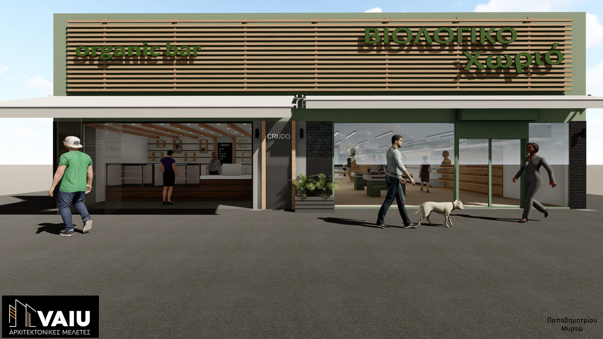 Η μελέτη αφορά την ανακαίνιση και εσωτερική διαμόρφωση καταστήματος βιολογικών προϊόντων, με στόχο τη δημιουργία ενός σύγχρονου, φυσικού και φιλικού προς τον επισκέπτη περιβάλλοντος. Η αρχιτεκτονική προσέγγιση βασίστηκε σε καθαρές γραμμές, γήινα χρώματα και φυσικά υλικά, όπως το ξύλο και το μέταλλο, τα οποία ενισχύουν τη βιώσιμη φιλοσοφία της επιχείρησης. Οι πράσινες αποχρώσεις στους τοίχους και την οροφή λειτουργούν ως αναφορά στη φύση και την οικολογική ταυτότητα του brand, δημιουργώντας παράλληλα μια αίσθηση ηρεμίας και φρεσκάδας. Η διάταξη του χώρου οργανώθηκε με τρόπο που επιτρέπει εύκολη κυκλοφορία και οπτική συνέχεια, ενισχύοντας την εμπειρία περιήγησης του πελάτη. Ιδιαίτερη έμφαση δόθηκε στις ζώνες προβολής προϊόντων και στη σχέση φυσικού φωτός με τα τεχνητά φωτιστικά, ώστε να αναδεικνύονται τα προϊόντα με ισορροπημένο και ευχάριστο τρόπο.