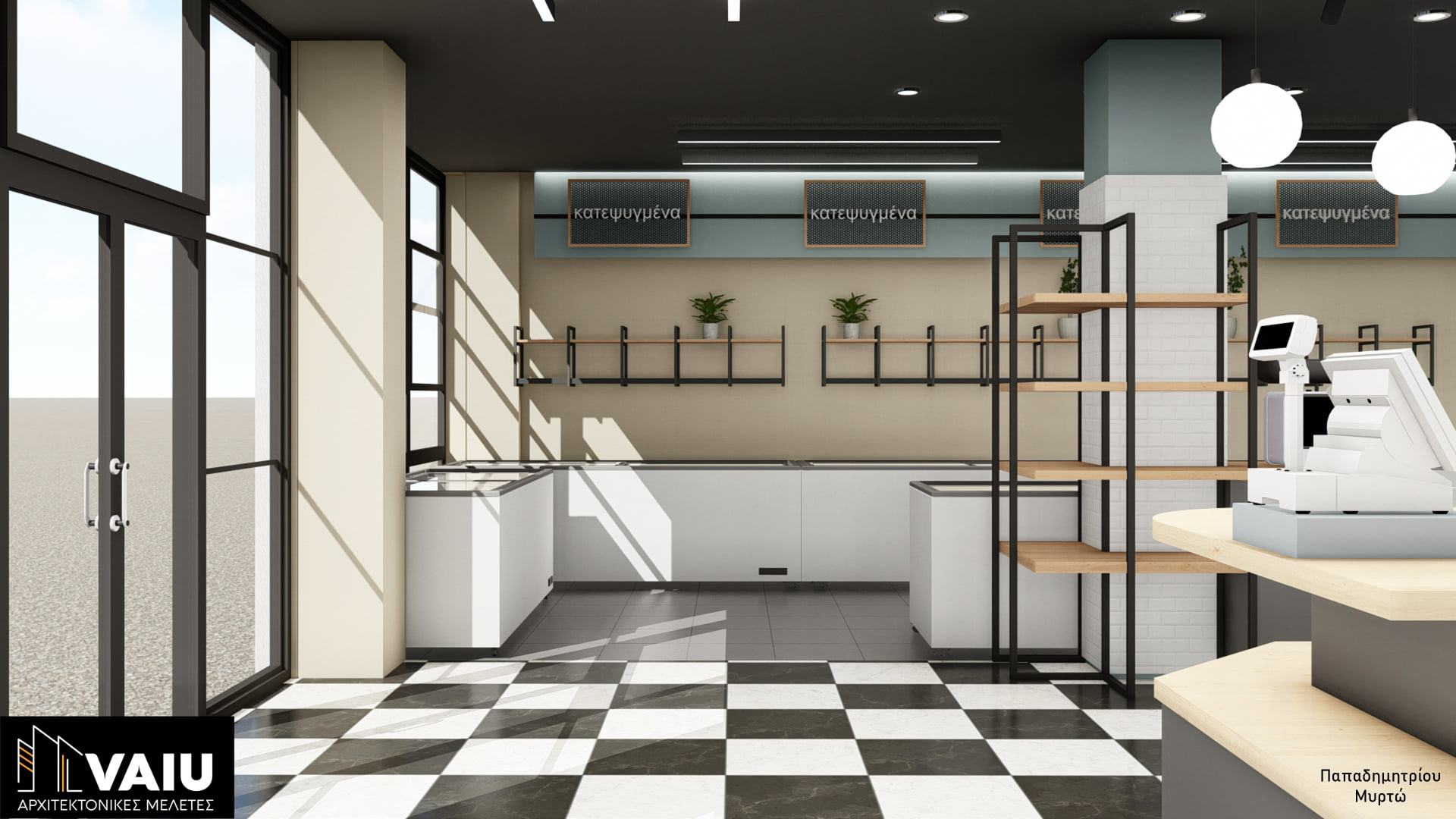 Η μελέτη αφορά τη δημιουργία ενός νέου, σύγχρονου καταστήματος εμπορίου κατεψυγμένων προϊόντων στην Καρδίτσα, σχεδιασμένου με στόχο τη μέγιστη λειτουργικότητα, την άνετη εξυπηρέτηση του κοινού και την αναβάθμιση της συνολικής αγοραστικής εμπειρίας. Η αρχιτεκτονική προσέγγιση βασίζεται σε καθαρές γραμμές, ισορροπία υλικών και εργονομική οργάνωση του χώρου. Η σύνθεση συνδυάζει βιομηχανικά στοιχεία, όπως μεταλλικές ραφιέρες και μαύρη ψευδοροφή, με θερμές υφές ξύλου και απαλά χρώματα, δημιουργώντας μια σύγχρονη και φιλόξενη αισθητική. Η παρουσία φυσικού φωτός από τις μεγάλες υαλοστάσεις ενισχύει τη διαφάνεια και την οπτική άνεση, ενώ η στρατηγική τοποθέτηση των φωτιστικών σωμάτων εξασφαλίζει ομοιόμορφο και λειτουργικό φωτισμό σε όλο τον χώρο.